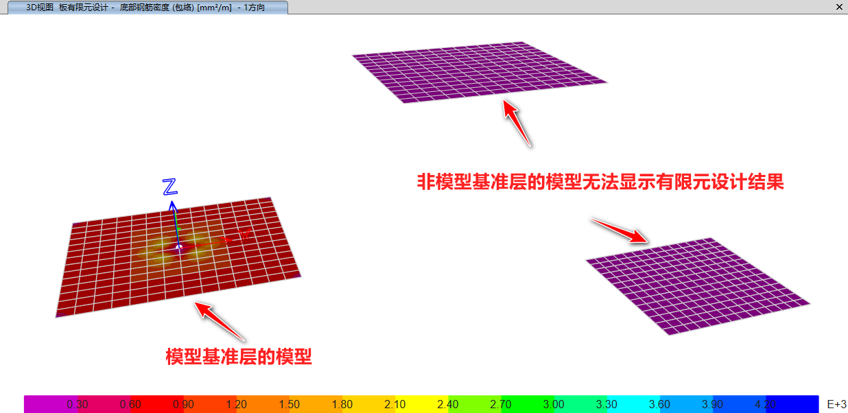 若将模型(包含各种对象和设计板带)移动到其他标高,程序在部分情况下仍可能显示设计结果(如板带配筋、冲切校核等)。然而,CSI官方明确指出:所有水平构件都应在模型基准层建模,否则结果可能无法显示或者不可靠。如图2所示,非模型基准层的板无法显示有限元设计结果和冲切结果。