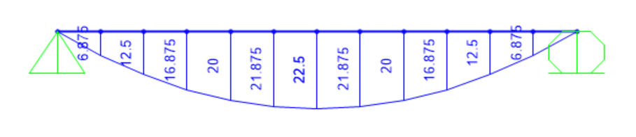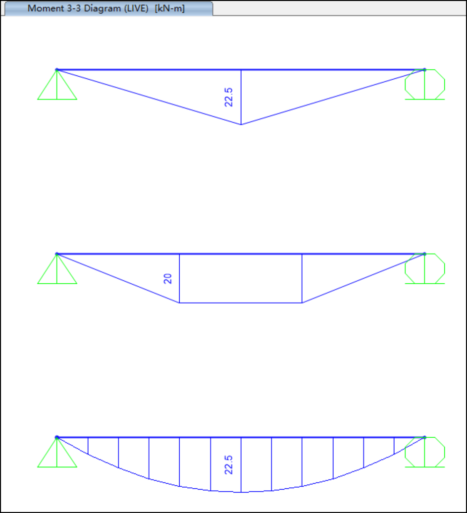 如图1所示,三个相同的简支梁在相同均布荷载作用下,随着测站(Output Stations)数量的不断增加,梁的弯矩图由最初的折线逐渐变得平滑,并最终逼近真实的抛物线形状。那么,测站是如何影响内力结果的?它与有限元剖分(Meshing)又有什么本质区别?