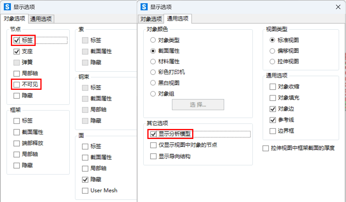 然后,点击【视图>设置视图选项】命令,勾选节点的“标签”和“显示分析模型”,同时可取消节点的“不可见”选项,使节点在视图中更清晰地显示。