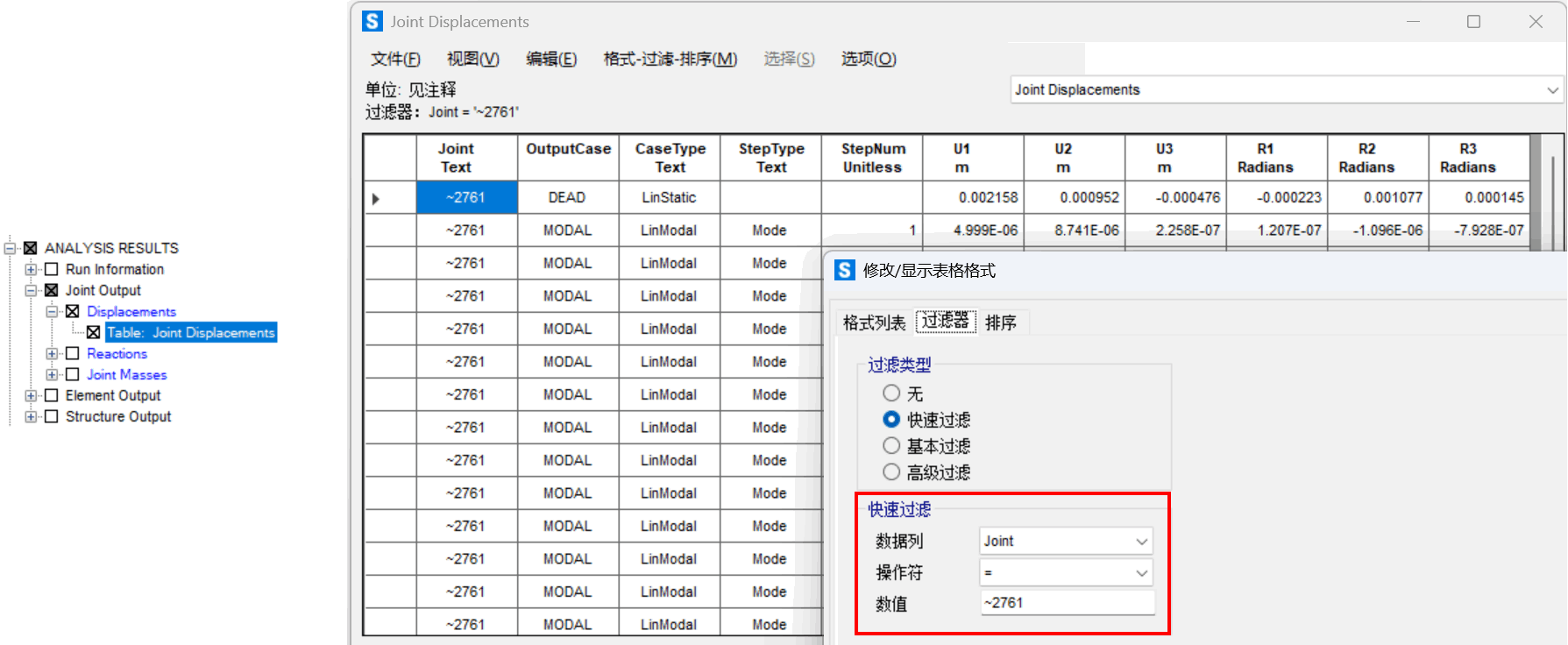 图5 SAP2000表格查看有限元节点位移