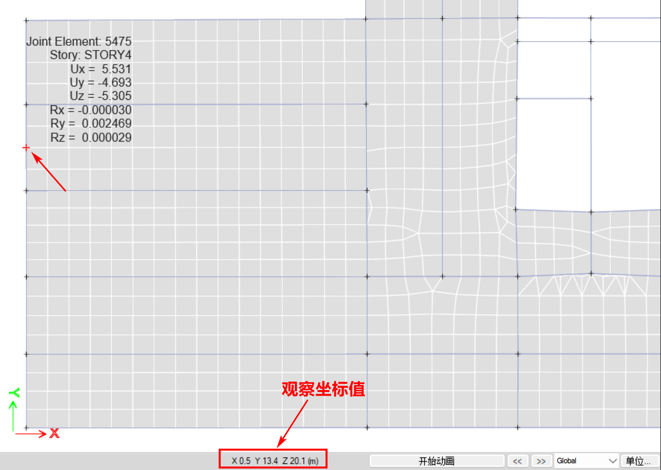 查看变形图,移动鼠标的同时观察状态栏中的坐标值,直至定位到目标有限元节点,如图8所示。