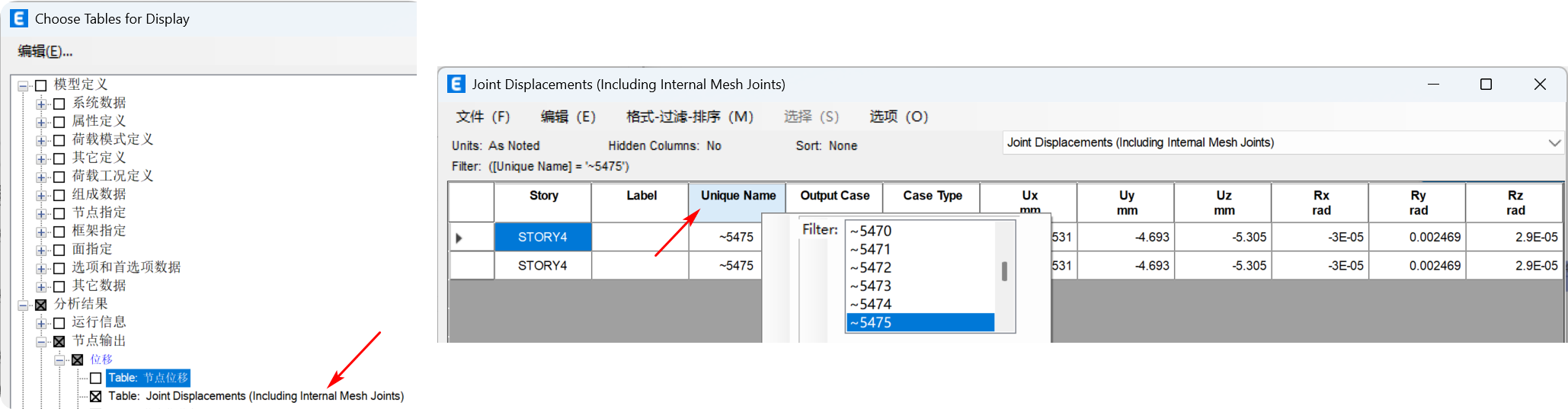 图9 ETABS表格查看有限元节点位移