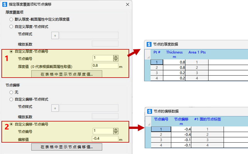 2)对绘制的加腋区板件指定厚度覆盖项和节点偏移。该板件的边缘厚度为 0.8m,中间厚度为 0.2m,因此需要依据节点位置指定板的厚度覆盖项和节点偏移,这里偏移距离为板件厚度的一半,具体设置如下图所示。