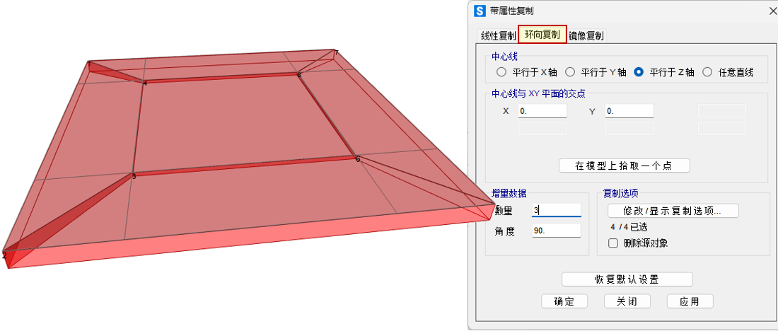 3)对该加腋区板件进行环形复制,形成四个变截面加腋,然后绘制中间厚度为 0.2m 的壳体。另外,对中间壳体的四个节点指定0.1m的节点偏移,使其顶面为插入点。