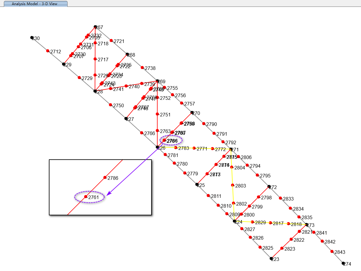 以图1中的有限元节点~2761为例,其坐标为 (100.5975, -24.321694, 1.623724)。根据该坐标缩小视图范围,如图2所示(只要能够在该范围内定位到目标节点即可)。坐标范围不宜设置过小,应确保包含该节点所在的杆件。